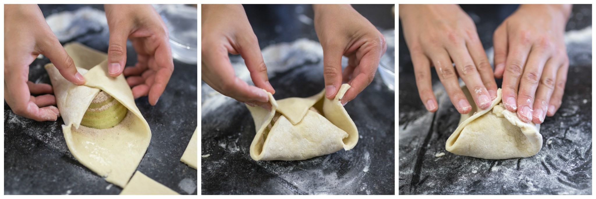 Moisten the edges of the square with a brush, and bring them up over the apple, tucking them together in the center of the apple.