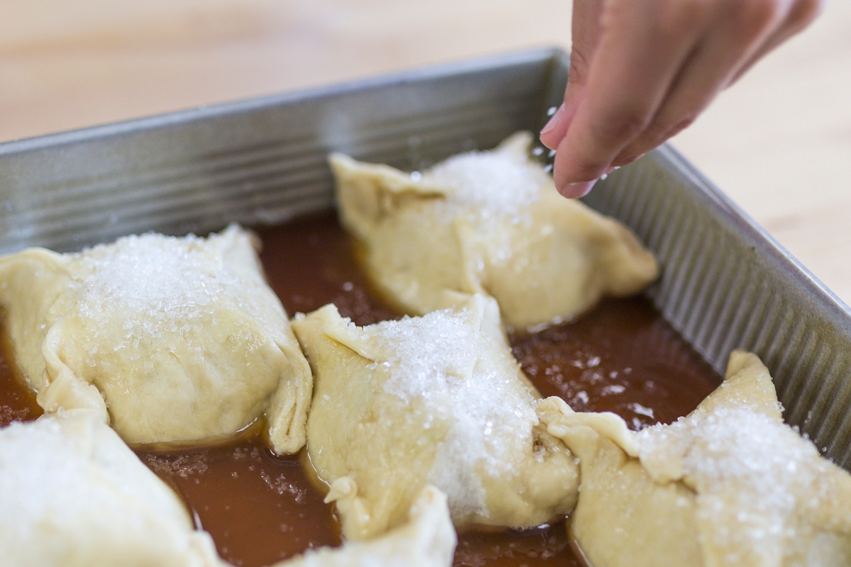 Place the apples, seam-side up, in the prepared pan. Repeat with the remaining dough and apples.