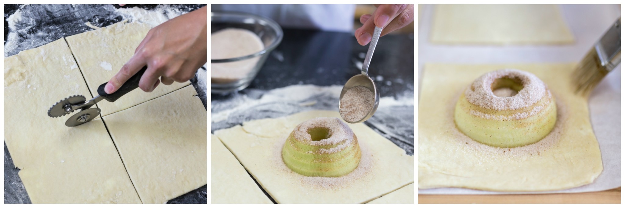Place an apple half on each square, and sprinkle each with a tablespoon of the cinnamon-sugar mixture.