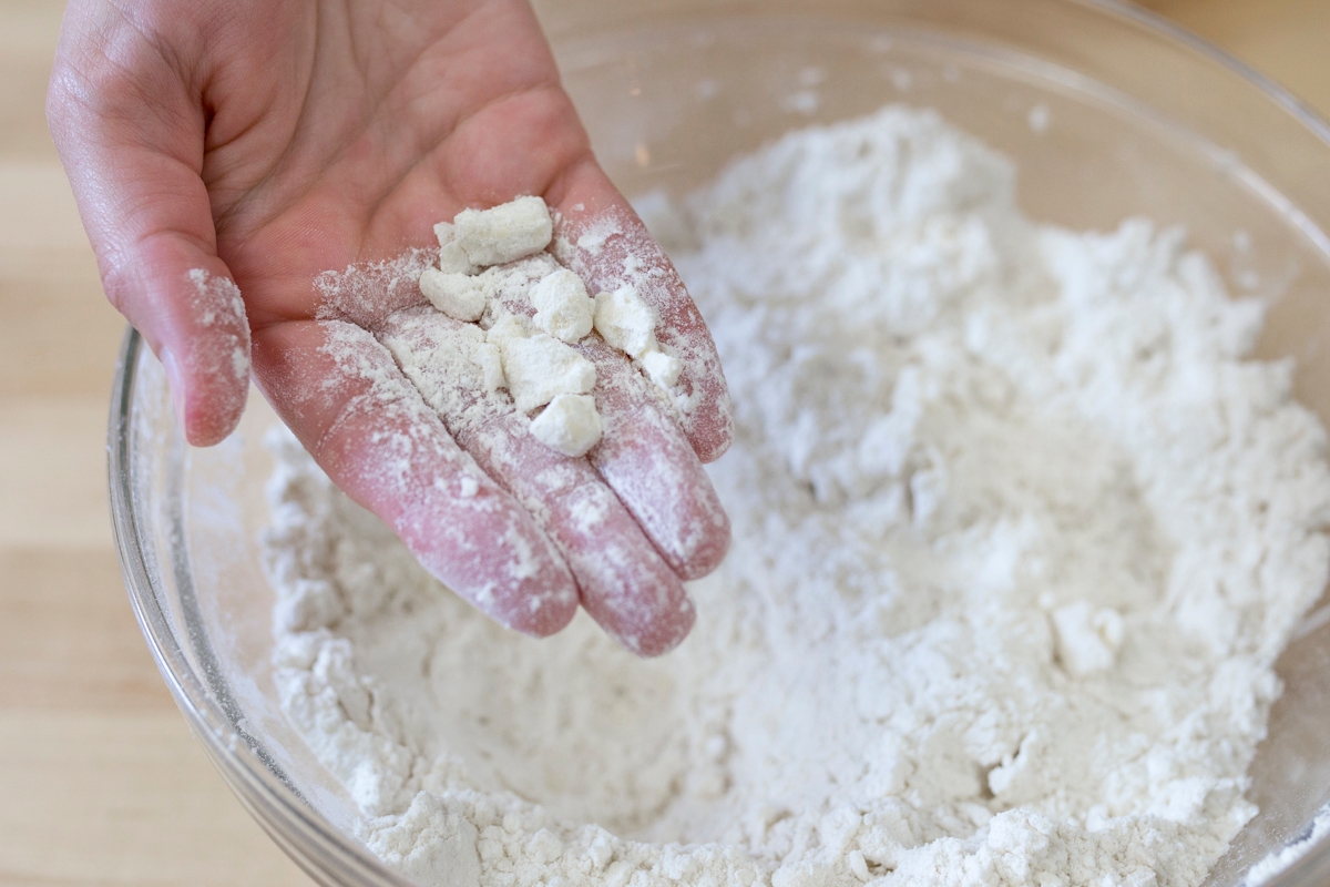 Work in 8 tablespoons (113g) unsalted butter until the mixture is crumbly, using your fingers, a pastry fork or blender, or a mixer, leaving some pea-sized pieces.