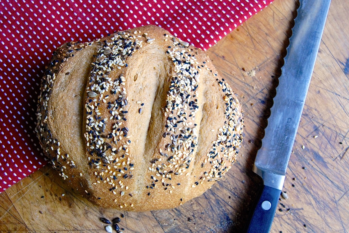 Just before baking, brush or spray the loaf with lukewarm water, and sprinkle it with seeds, if desired. I'm using our Artisan Bread Topping mix here.