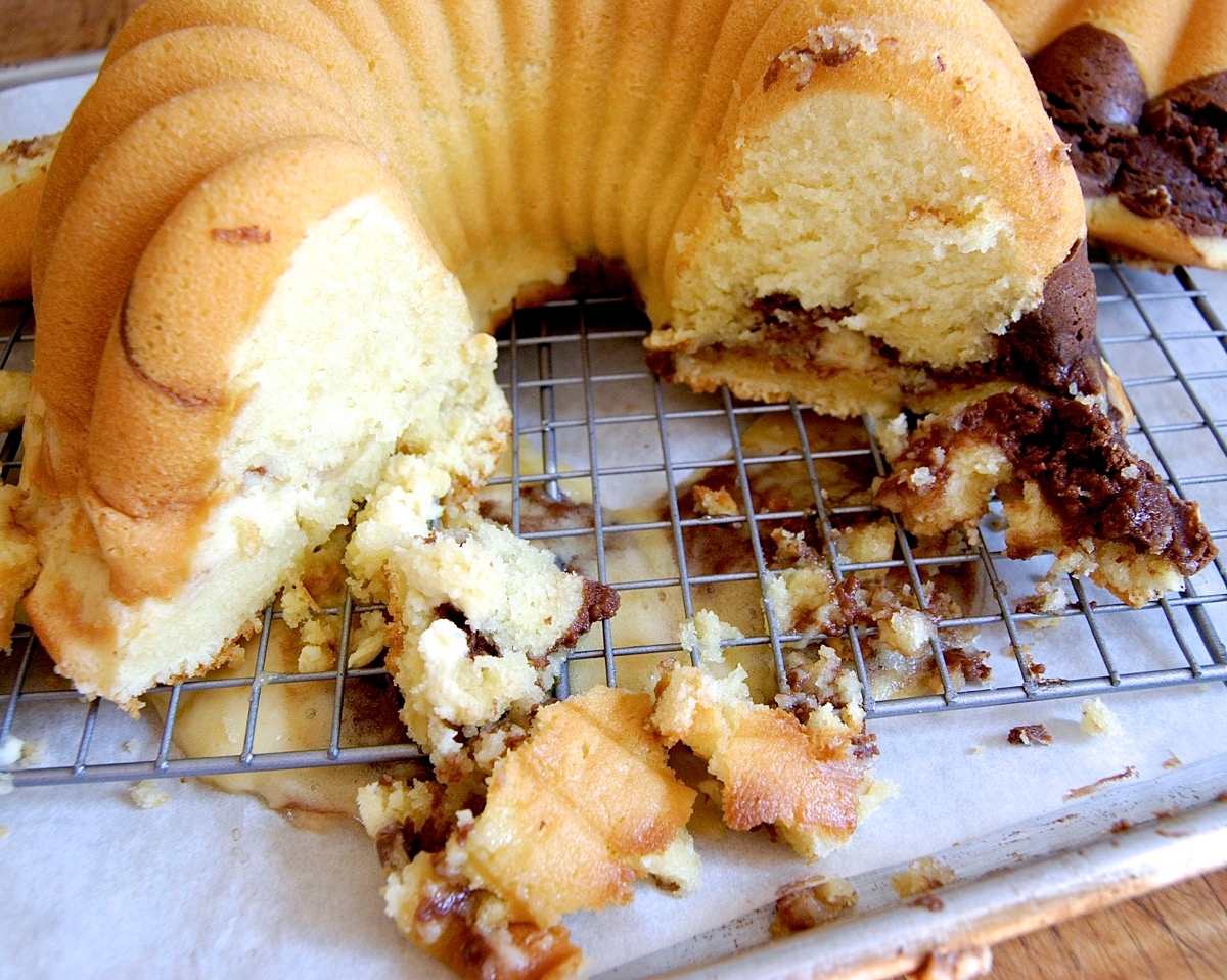Filled bundt cake, test #1: chocolate cheesecake filling. More like chocolate cheesecake spilling.