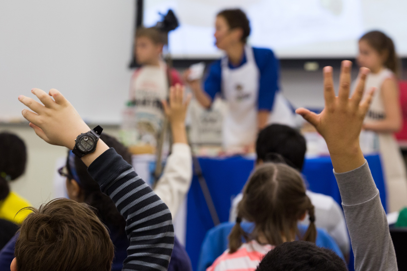 Hundreds of fourth graders are gathered, at rapt attention, listening to Paula Gray talk about yeast. They wave their hands in the air, eager to answer her questions. Fascinated, they watch as she mixes bread dough and discusses gluten development.