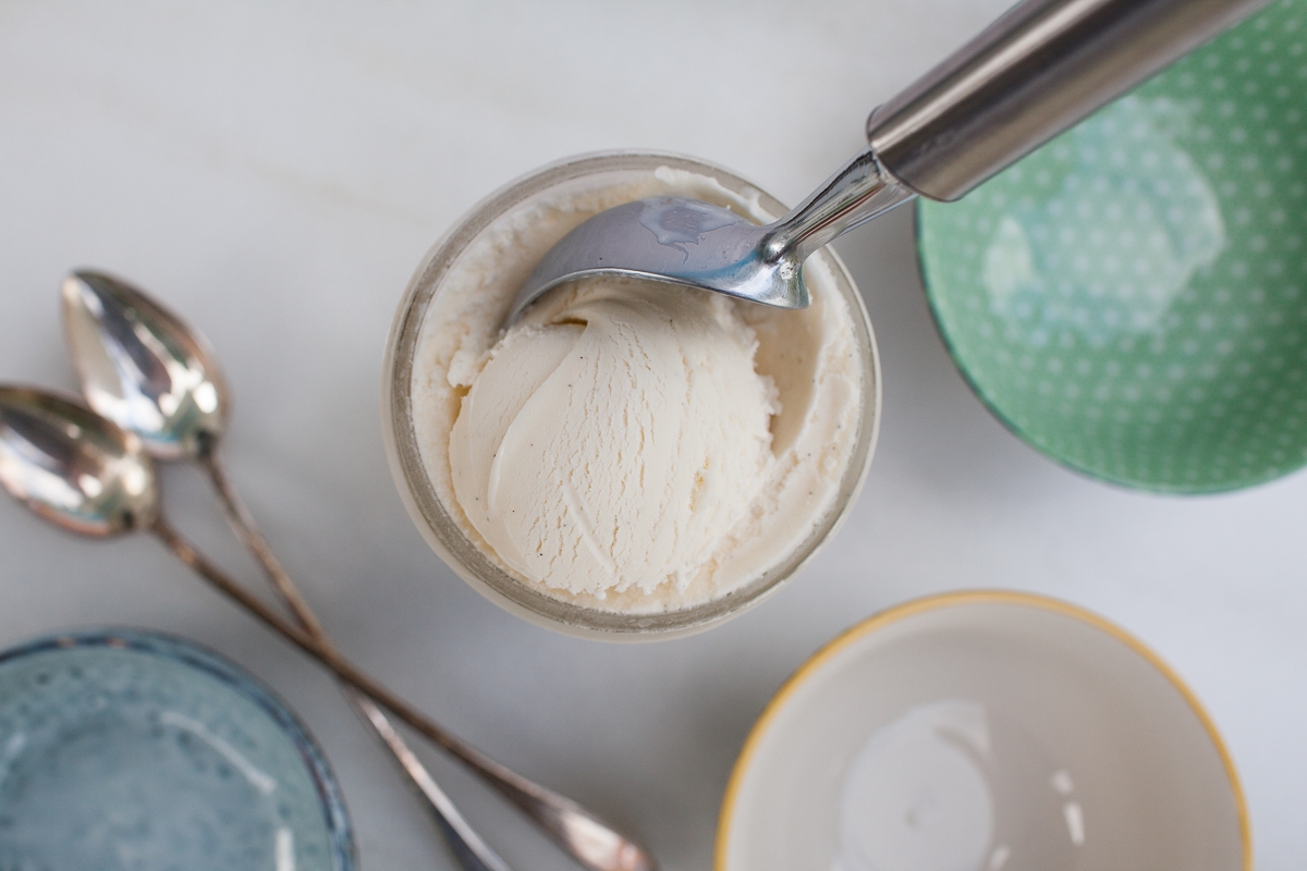 Note: You can substitute half-and-half for both cream and milk here. Half-and-half helps ensure you’re not left with any oily mouthfeel from inadvertently over-churning your ice cream.