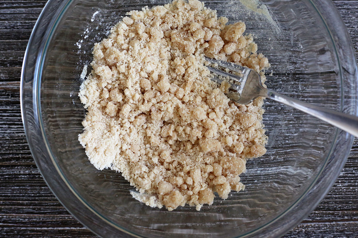 This topping is a simple combination of flour, sugar, and melted butter with some flavorings (cinnamon, salt, almond extract, and vanilla). You get big, soft chunks of streusel topping that resemble the topping of a really good coffeecake.