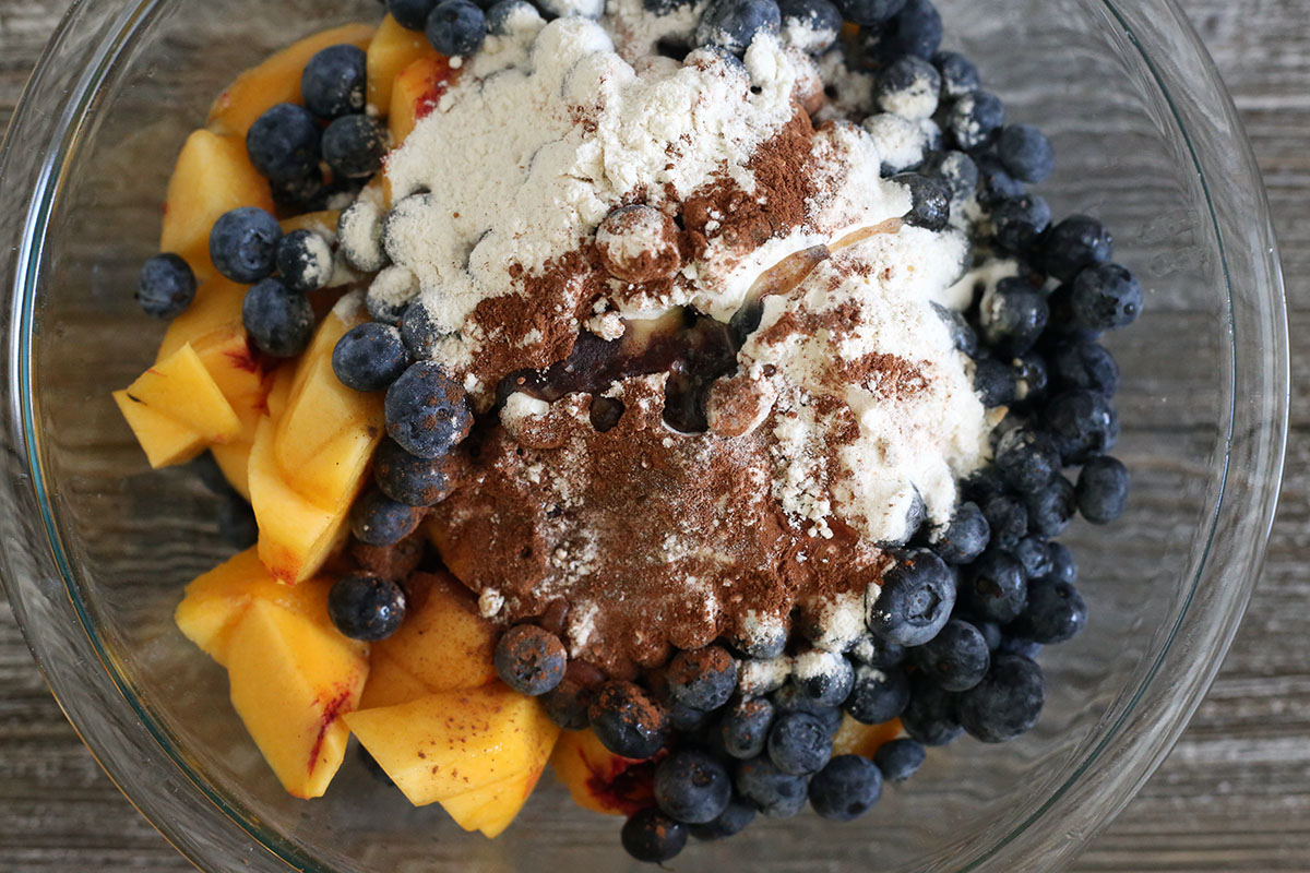As with fruit pies, the trick to achieving the proper texture in your filling is all about the thickener. The filling of a summer fruit crisp can easily become too liquid-y, especially when you're using very ripe fruit like blueberries and peaches. (This all applies for frozen fruit as well.)