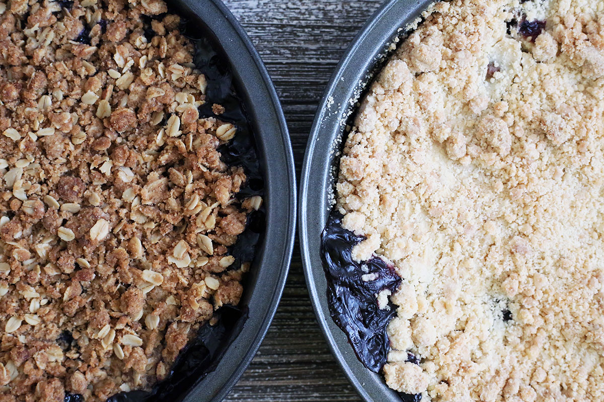 I like pairing this dessert with whipped cream or ice cream, and the crunchier topping is a good foil to the soft fruit filling. Another characteristic: This topping will brown much more than the other, so it has a prettier and more traditionally golden brown appearance.