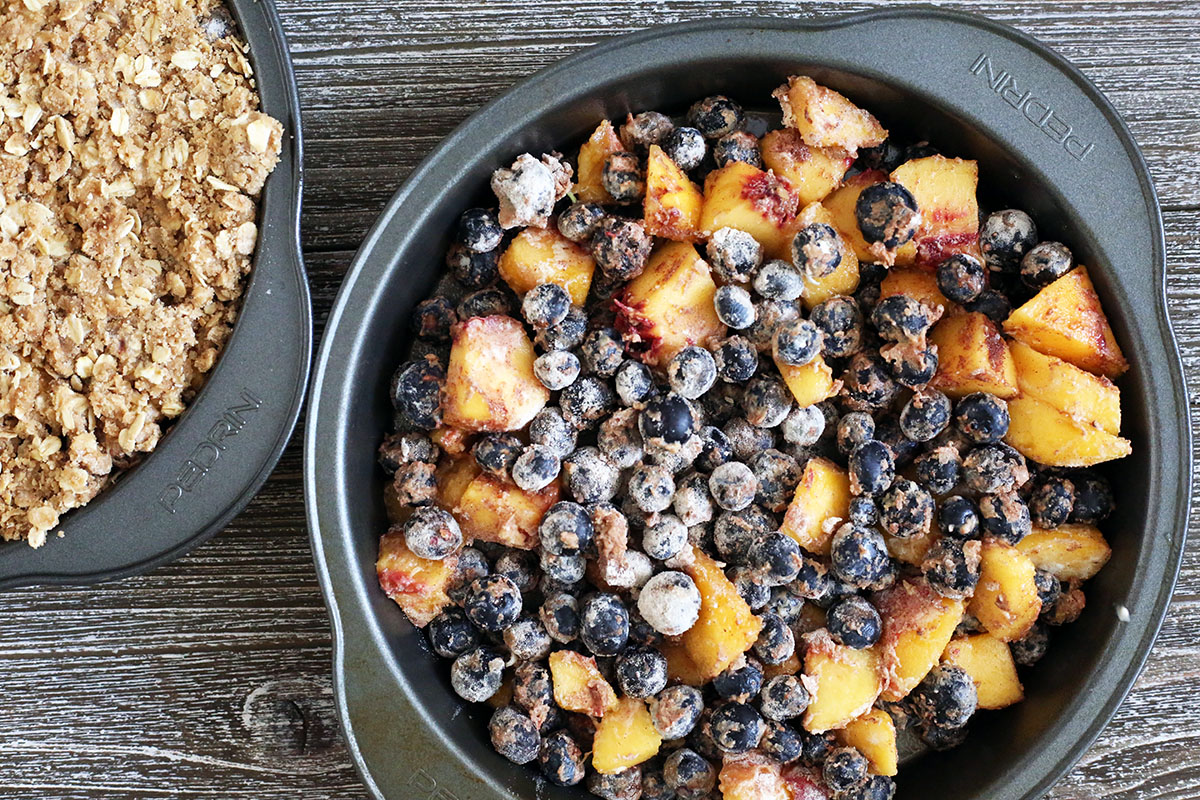In that spirit of flexibility, you'll see that our recipes aren't very specific about pan size. The Blueberry Crisp recipe suggests a 9" round or 8" square pan. The Summer Fruit Crisp recipe suggests a 9" square or "similar-sized dish." Feel free to use whatever pan you have on hand; just ensure that the fruit filling is at least 1 1/2" deep. If your filling is spread too thinly, it'll cook down too much and will get gummy and overly thick. You don't need to worry about the filling being too deep, as long as there's enough space in your pan to add your topping.