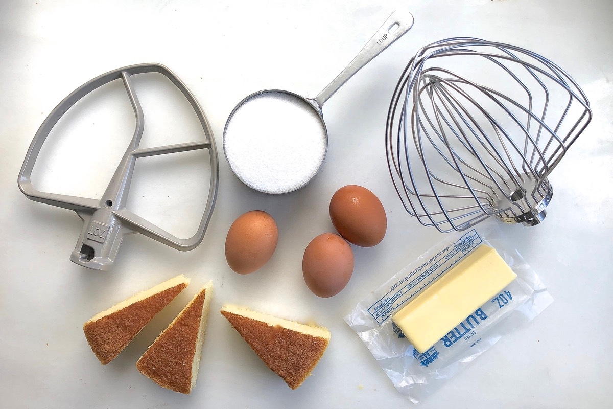 Chiffon cake, a variation on sponge cake, usually calls for whole eggs and sugar to be beaten until fluffy. A typical chiffon cake like our Classic Birthday Cake (above, without its frosting) includes baking powder or baking soda, so while it doesn’t rely 100% on your beating prowess to rise, beating eggs to their fluffiest is still important.