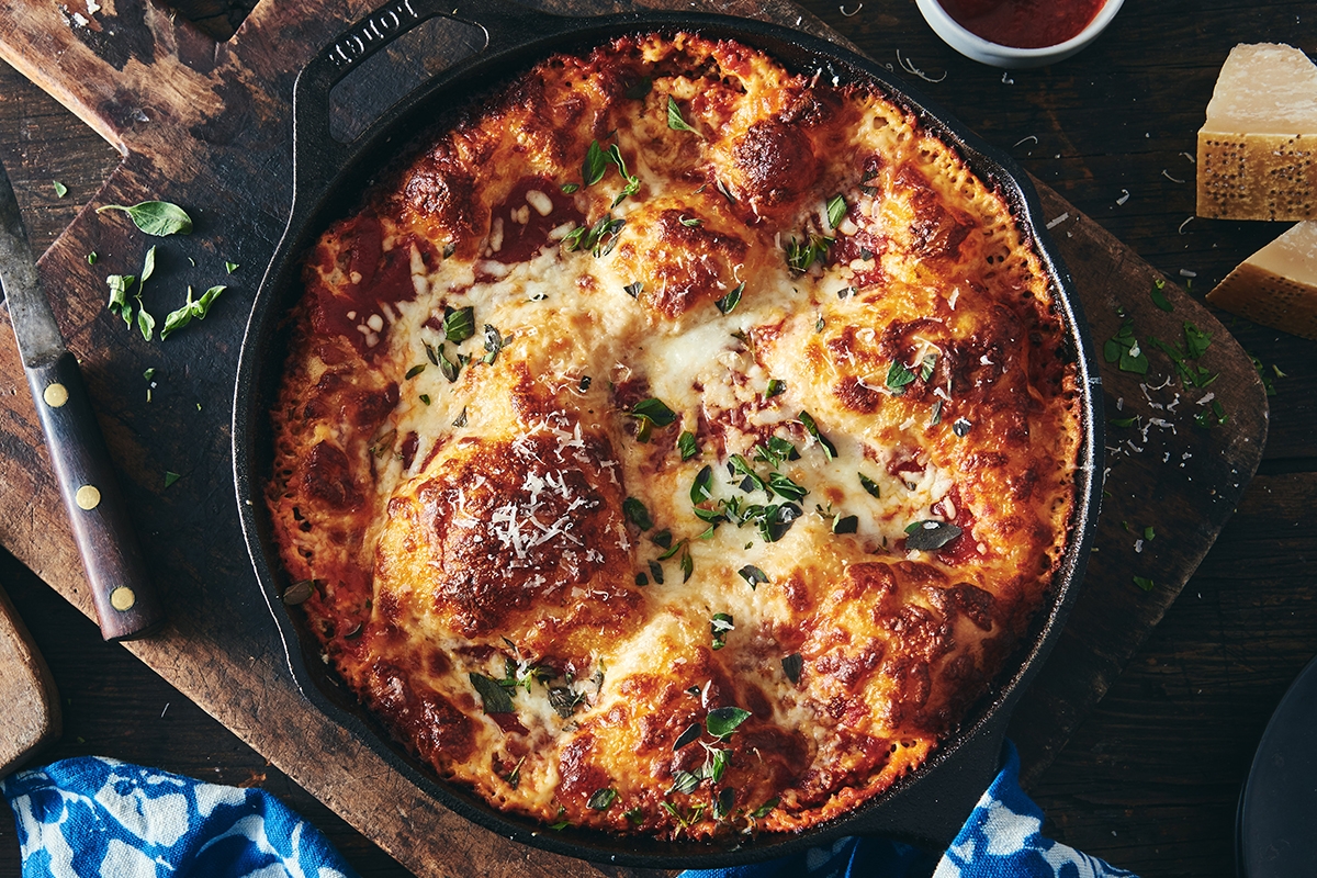 Rather than rely on a baking sheet or standard pizza pan, you bake our Recipe of the Year in a cast iron skillet. The pan’s heft and dark color act like a pizza stone, translating the oven’s heat into a crunchy-crispy, totally crave-worthy bottom and side crust.