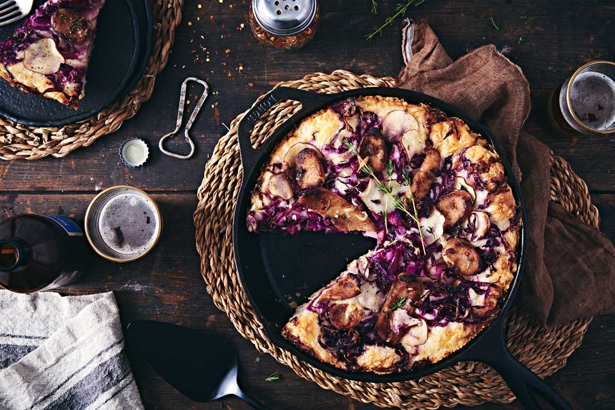To make it: Drizzle extra-virgin olive oil over your risen pizza dough. Very thinly slice enough red potatoes to cover the surface of the dough, and grate 1 cup (113g) fontina cheese. Sauté 1 cup (71g) sliced red cabbage with 2 tablespoons (26g) brown sugar, 1 tablespoon vinegar, a pinch of salt, and 1/3 cup (76g) water until soft (about 8 to 10 minutes over medium-low heat). Spread the cabbage over the pizza dough, then top with the grated cheese and a layer of the potatoes. Top with sliced cooked sausage and sprinkle with 2 teaspoons of chopped fresh thyme.