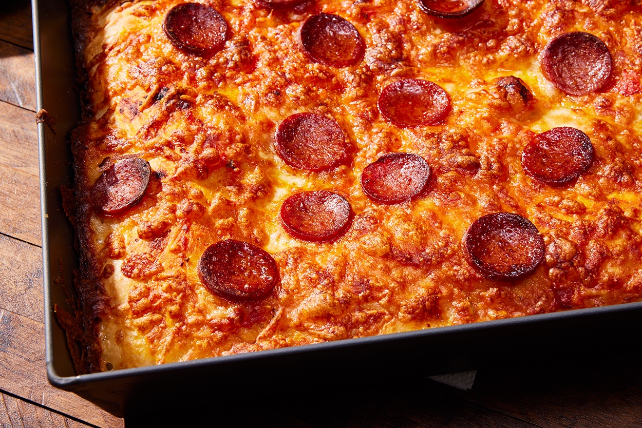 I resisted buying a Detroit-style pizza pan for a long time. Not because I don’t like the style of pizza for which this pan is intended: I mean, who can resist a rectangular pizza with a thick crust that’s both chewy and crispy, topped with cheese that’s spread all the way to the edges so that it caramelizes against the sides of the high-sided pan?