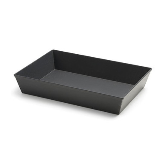 The Detroit-style pizza pan, manufactured in Washington state by LloydPans, is nearly black in color, thanks to the process of anodization — in which the pan is subjected to an electrolytic process that involves immersing the pan in a chemical bath and then applying an electric current to it — causing a layer of oxide to be produced. The oxide hardens on the pan, leaving it with a dark, extremely durable, nonreactive, rust and stick-resistant coating.