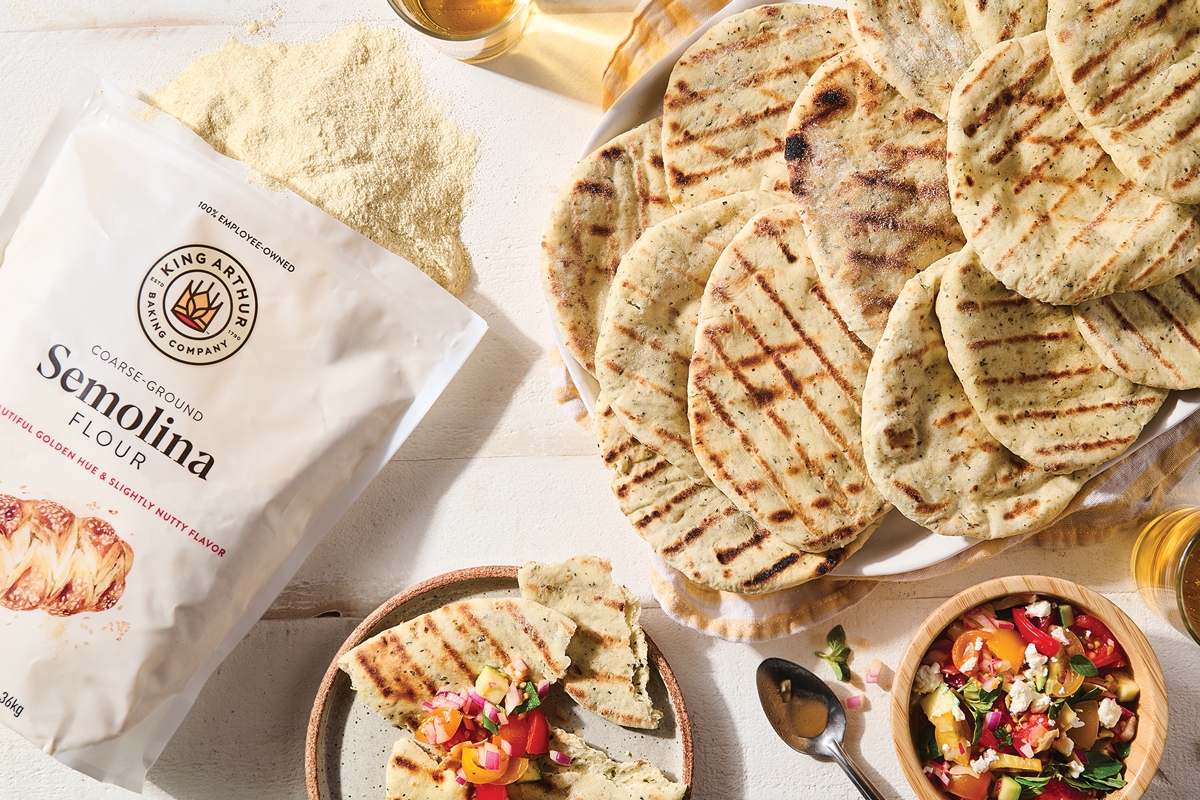 Beyond just adding to batters and doughs, semolina is also a smart ingredient to keep on hand for dusting and sprinkling, as the coarse texture helps keep doughs from sticking. You’ll often see it used in this way in recipes for English Muffins and Pizza — in fact, dusting with semolina is one of our top tips for loading your pizza in the oven without sticking.