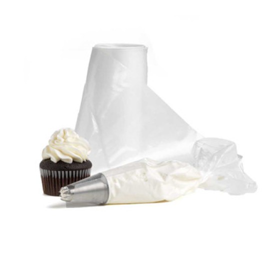 Place a medium or large round tip into a pastry bag and snip the end. Push the tip until it fits snug into the pastry bag. Fold half of the pastry bag over itself and place it into a tall heavy glass. This will help you fill the pastry bag with frosting. Start off by filling the pastry bag with the frosting color that you want to be on the bottom of the cake. If you’re doing a monochromatic gradient, start with the darkest color here. Push any air from the bag by gathering the frosting toward the tip — a straight edge like a bench knife is helpful here to scrape the frosting toward the bottom of the bag.