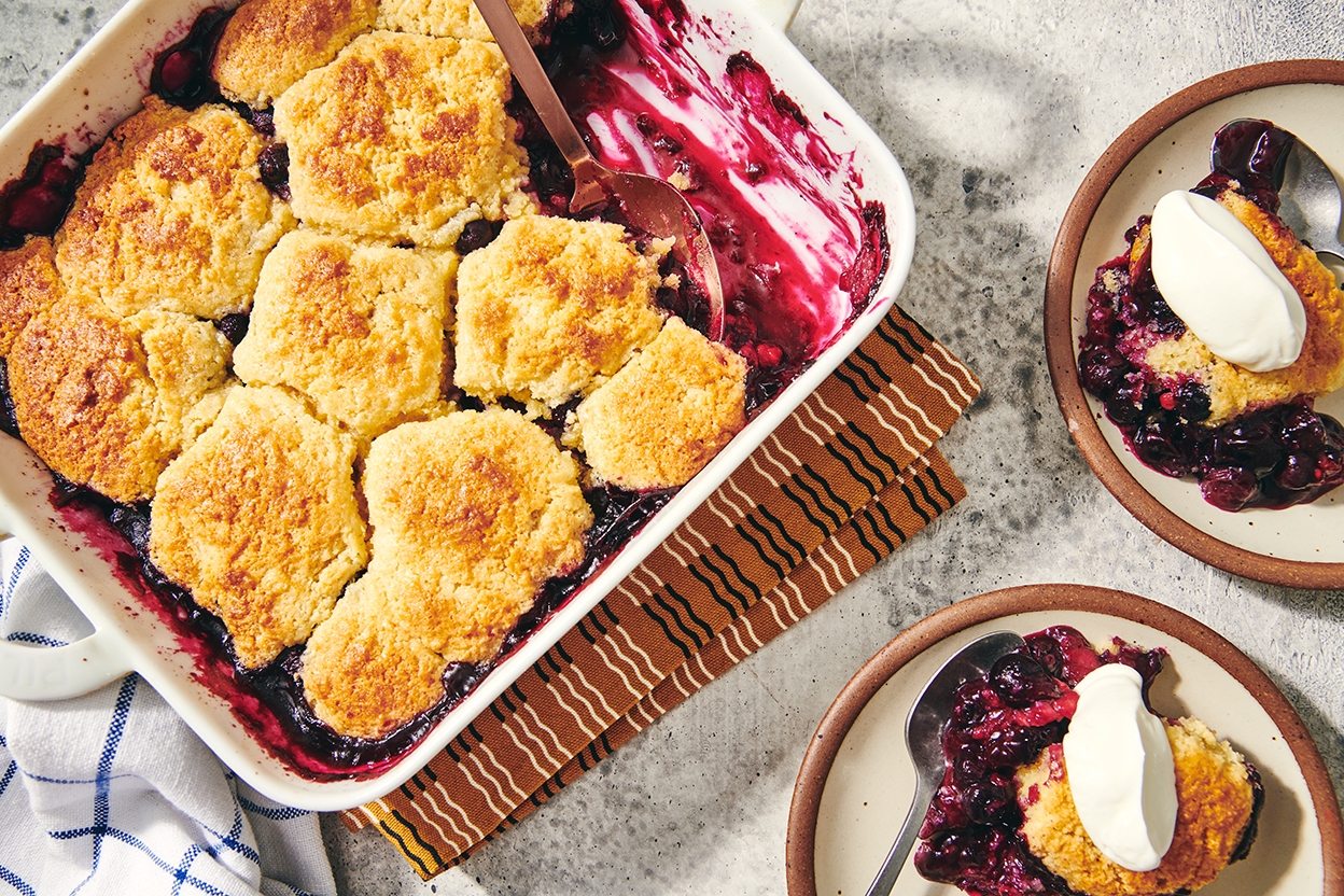Scoop or spoon the dough over the fruit in the baking dish. Bake the cobbler for 60 minutes, or until the fruit is bubbling in the center and the topping is cooked through.