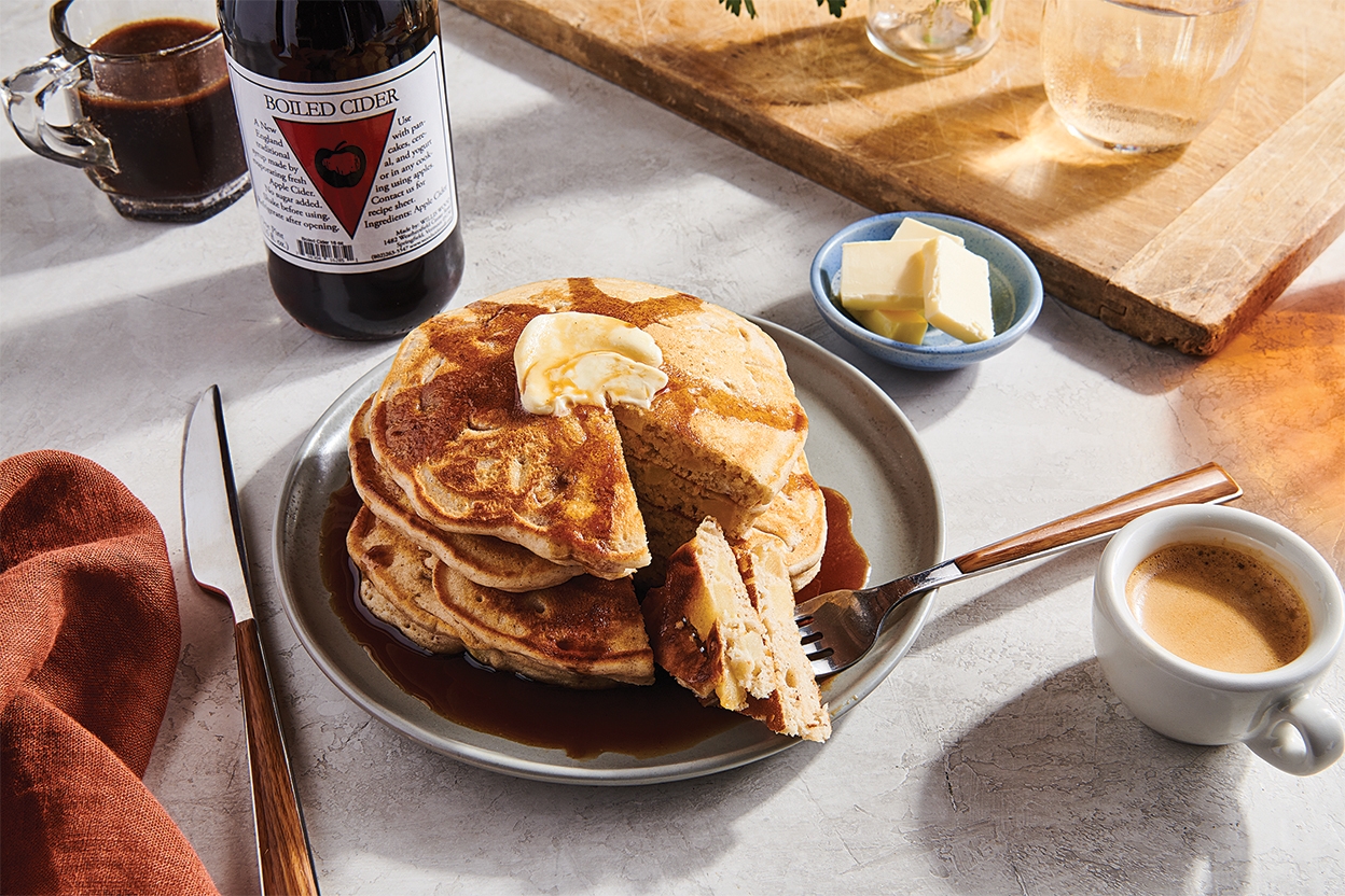 These pancakes are great any time of the year, but we particularly like them during the crisp autumn days just after the apple harvest. The boiled cider for the syrup is an old New England specialty; it's simply apple cider which has been boiled down to syrup consistency, somewhere between cider and jelly.