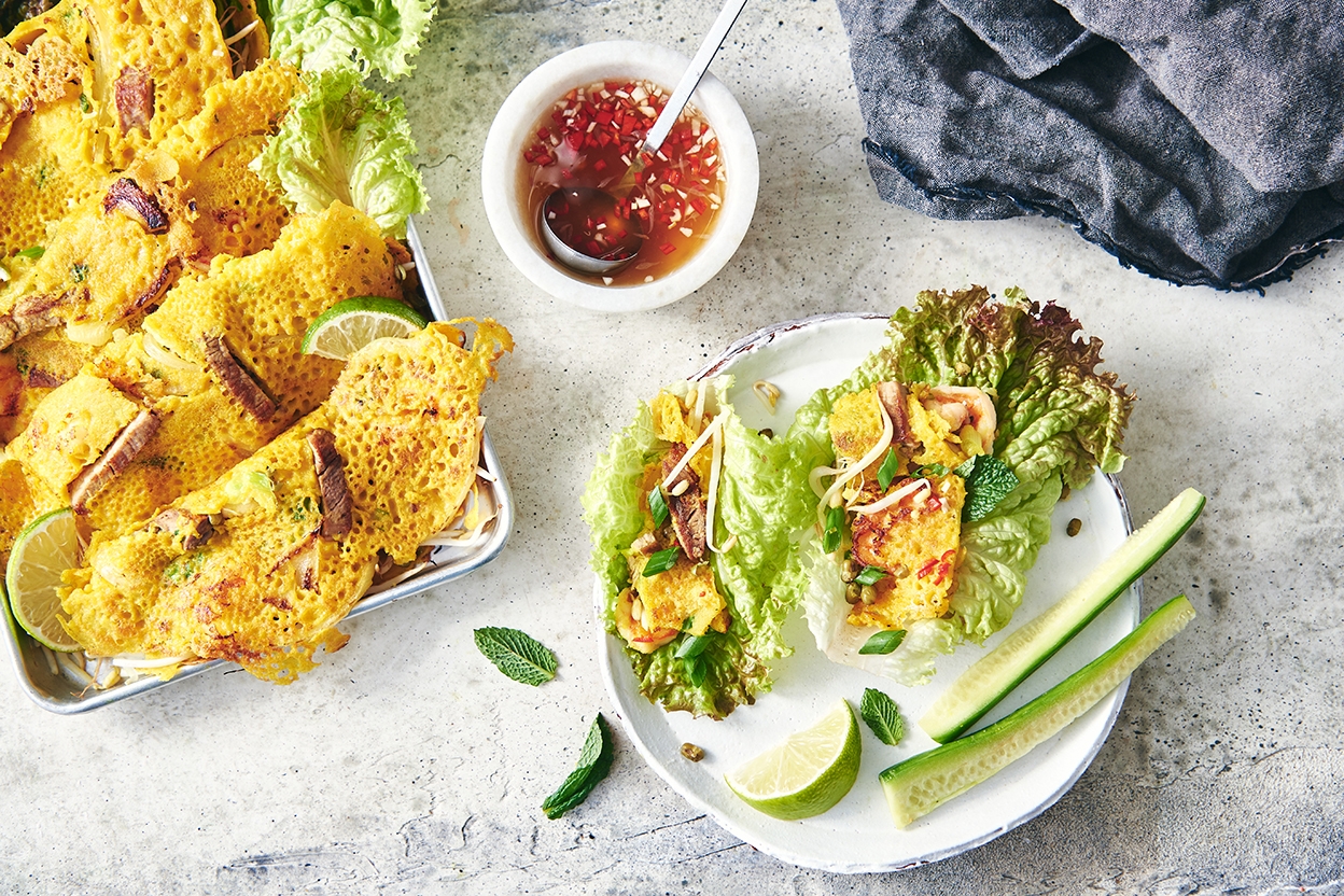 To serve the crêpes: Wrap the fresh greens around the strips of crêpe like a lettuce wrap, then dip into the sauce and enjoy!