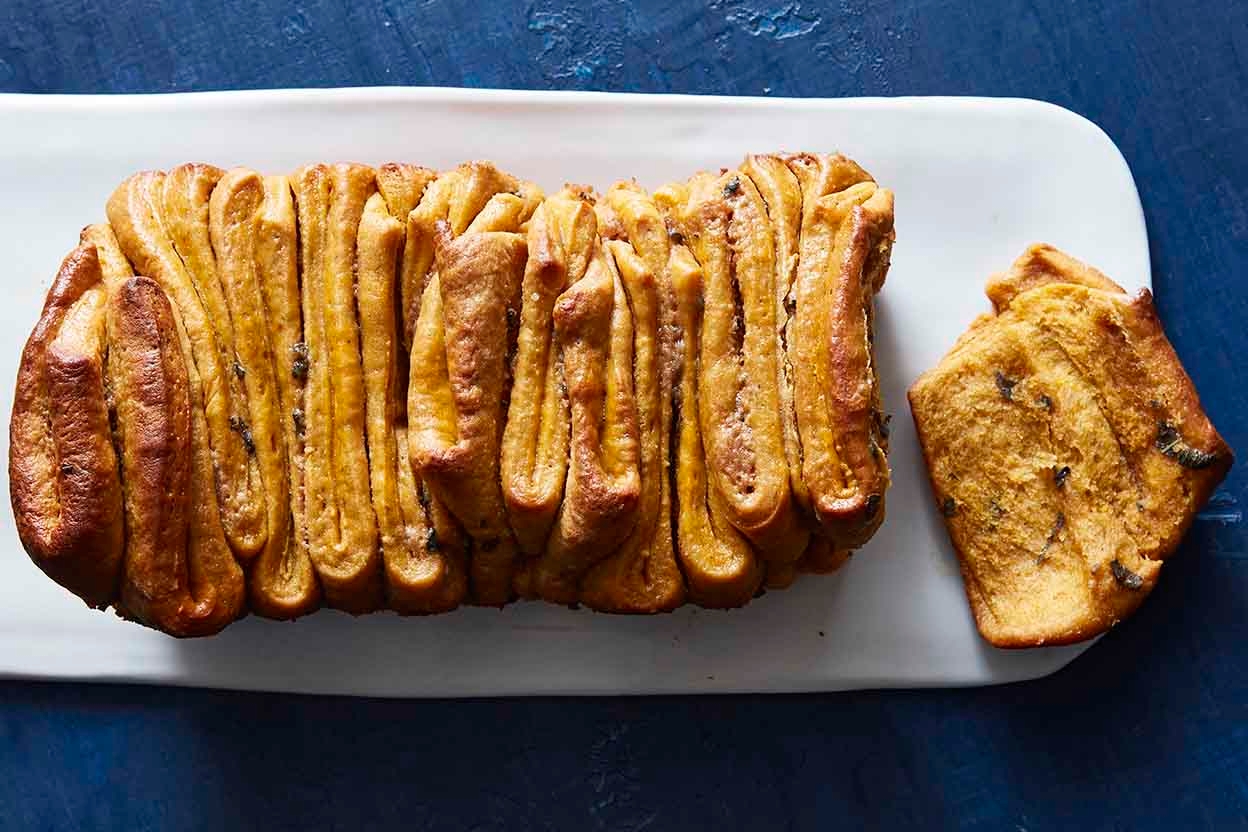 Uncover the bread and bake for 32 to 35 minutes, until the center of the loaf reaches 190°F when measured with a digital thermometer. Tent with foil for the last 15 minutes of baking if the top is browning too quickly. Remove from the oven and cool in the pan for 15 minutes before pulling off individual pieces to serve warm.