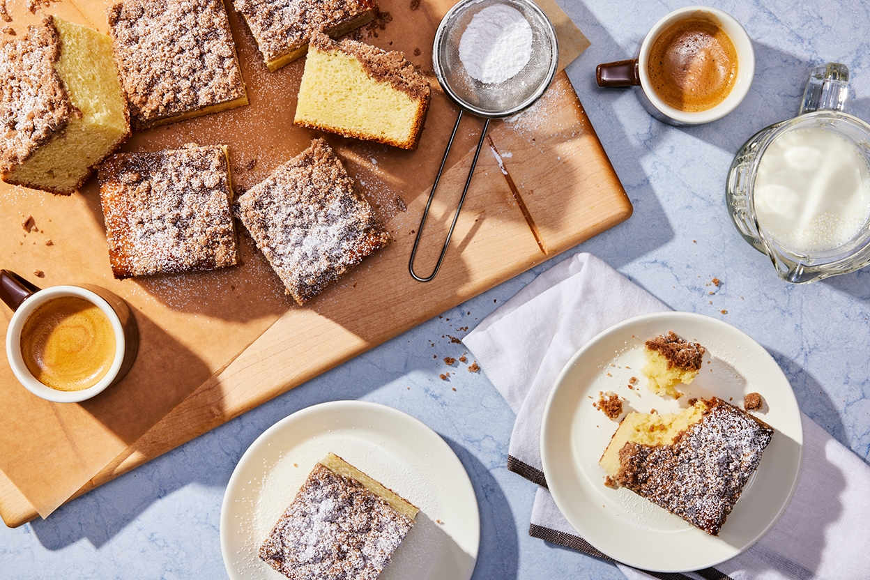 The secret to this light, fluffy, and perfectly sweet coffee cake is our Golden Yellow Cake Mix, which is used in both the batter and the buttery, cinnamon-scented crumbs. The reverse creaming method, in which butter is coated in flour, helps keep the cake extra tender and moist. It needs no elaboration, but the addition of blueberries to the batter and nuts to the topping take this coffee cake over the top.