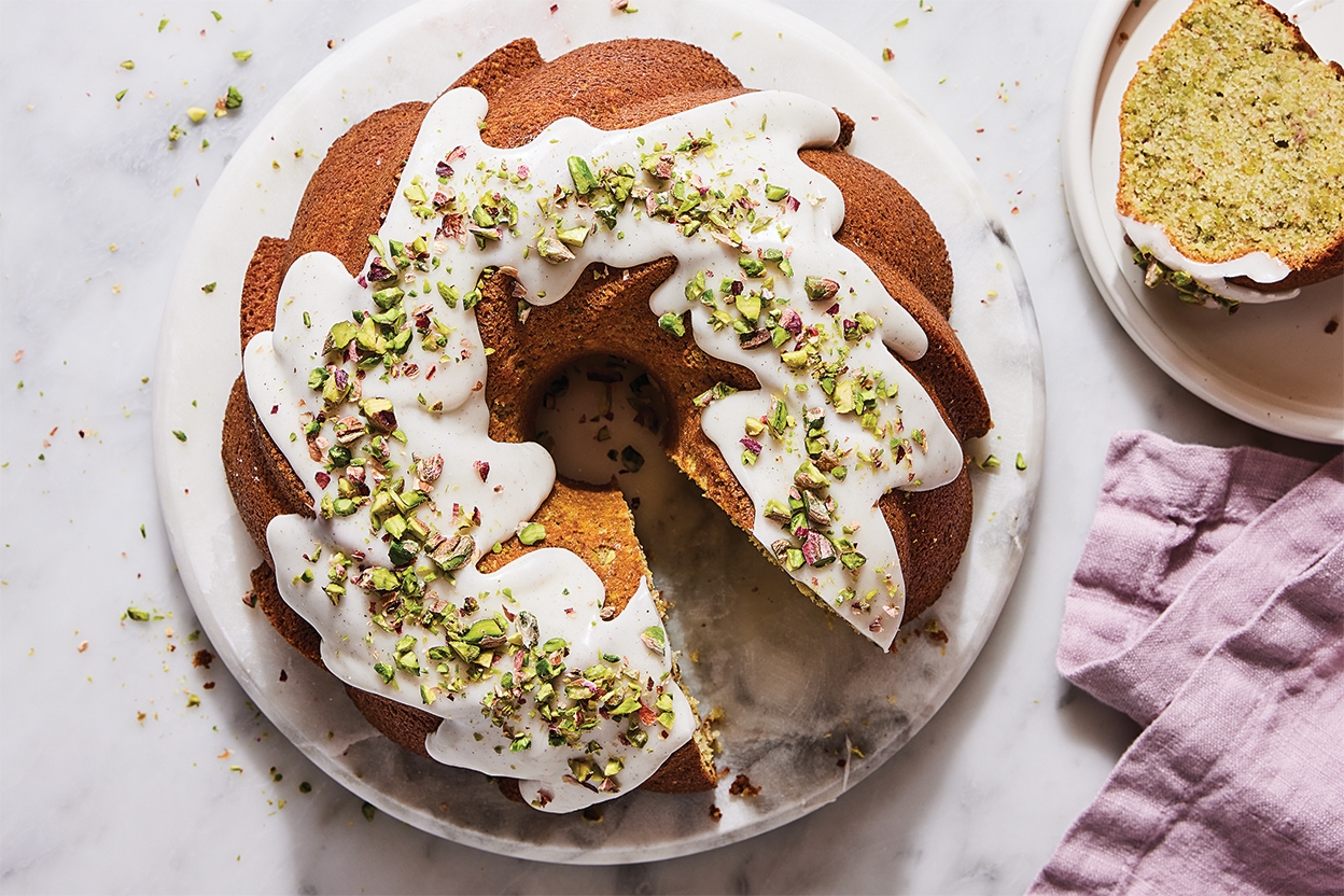 With robust cardamom, pistachio, and lemon flavors, this elegant Bundt cake is both moreish and memorable. Enjoy it as an everyday snack or tea-time treat or for a celebratory occasion like Diwali — which is how contributor and author Pooja Makhijani came to share this recipe with us.