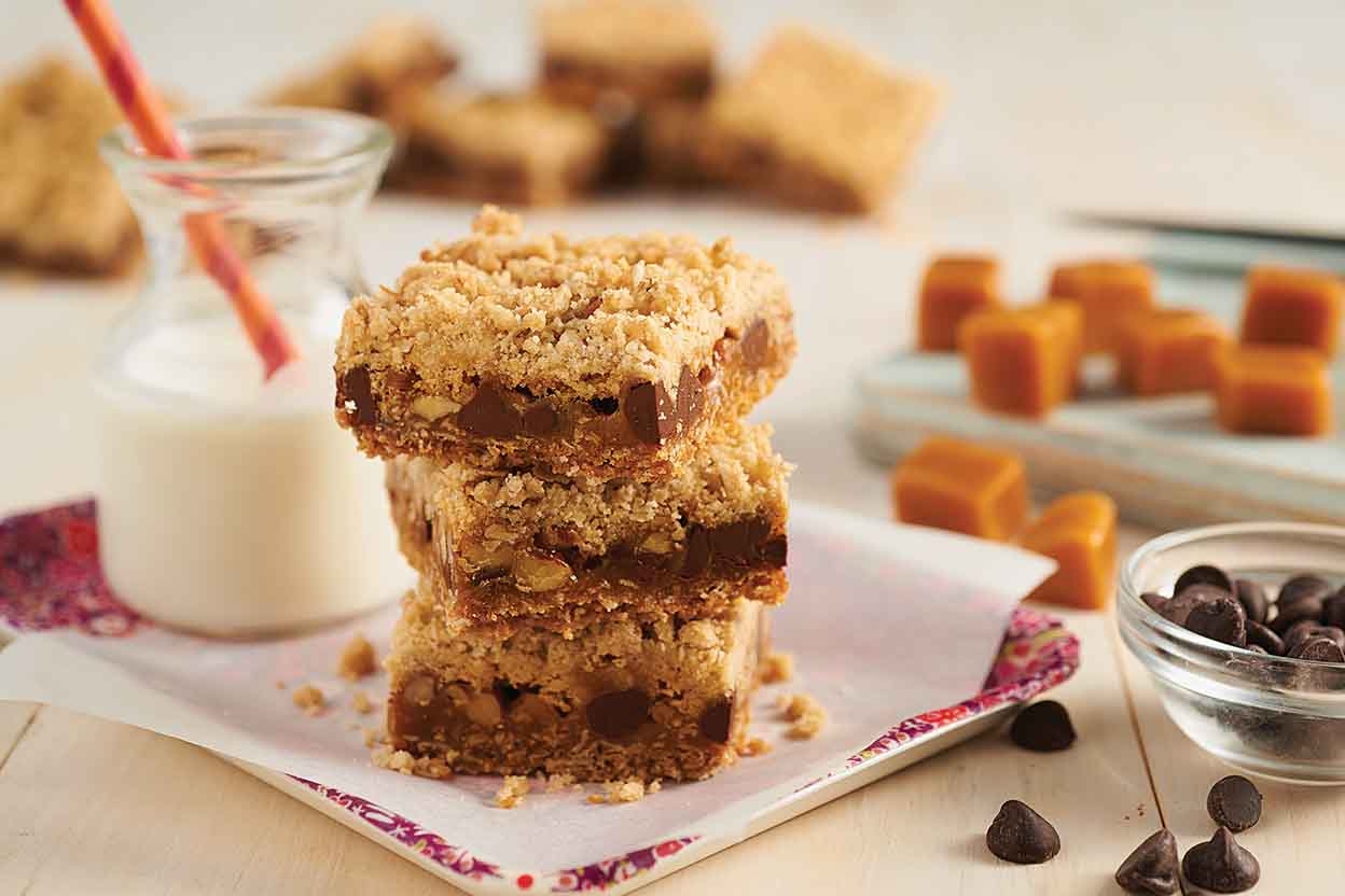 Scatter the chocolate chips and pecans evenly over the firm caramel layer, then top with the remaining crumb mixture.