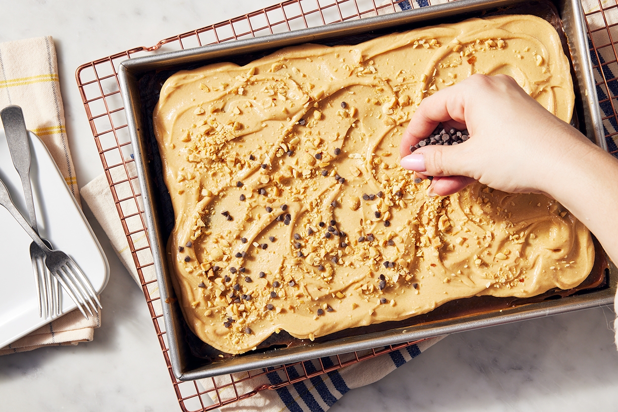 Poke cakes, often made by pouring instant Jell-O or boxed pudding mix into a sheet cake poked with holes, became popular in the U.S. in the 1970s as a way of combining convenience food items into a fast and easy dessert. While many poke cakes feature fruity fillings, we chose the more indulgent combination of chocolate and peanut butter. Our homemade poke cake recipe may require a few more steps than the original, but the from-scratch chocolate cake, rich peanut butter ganache filling, and fluffy peanut butter frosting are worth the extra effort.