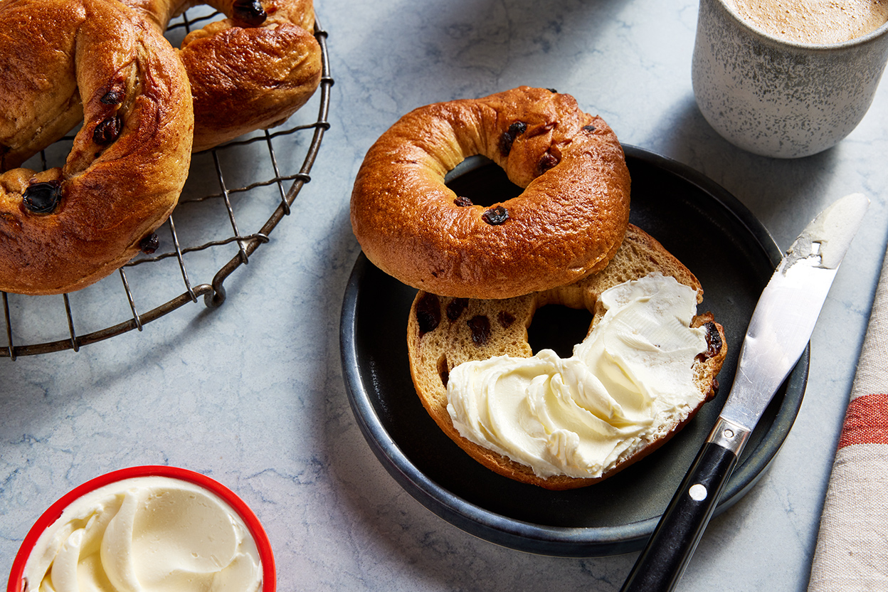 Unlike many cinnamon raisin bagels, which are cinnamon in name and hue alone, these have a cinnamon flavor you can see, smell, and taste. Their superior flavor is due to the distinct way the cinnamon is incorporated: It’s mixed with water, spread over the dough, then folded and chopped in so that it remains in visible streaks even after shaping. The raisins stay juicy and plump, thanks to a soak in hot water, and the use of High-Gluten Flour makes the bagels extra chewy.