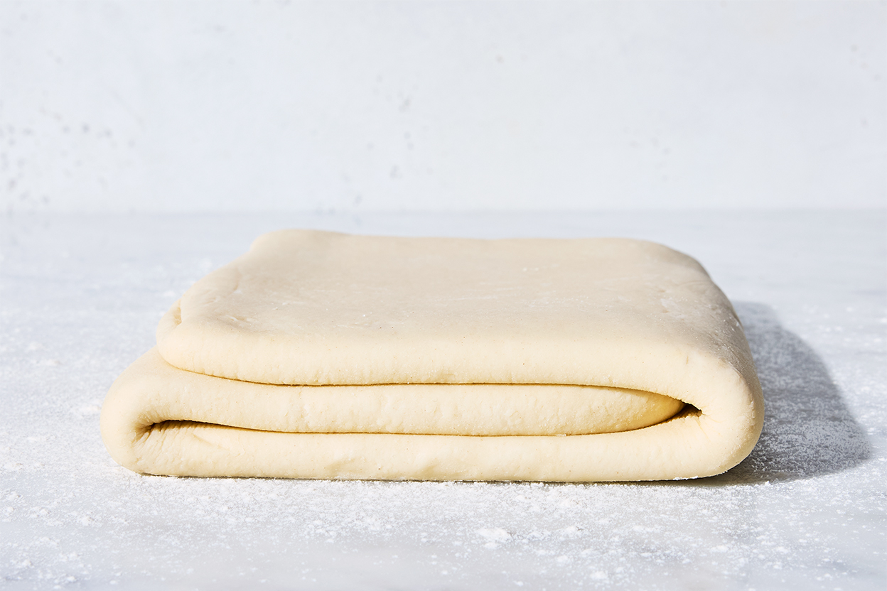 To laminate the dough: Remove the dough from the refrigerator and place it on a lightly floured surface. Gently roll it into a 12" square. Note: Throughout the laminating process, aim to keep the dough cool, between 35°F and 45°F. If the dough is too warm, return it to the refrigerator for a few minutes to chill. If it's too cold, let it sit on the counter for a few minutes to warm up.