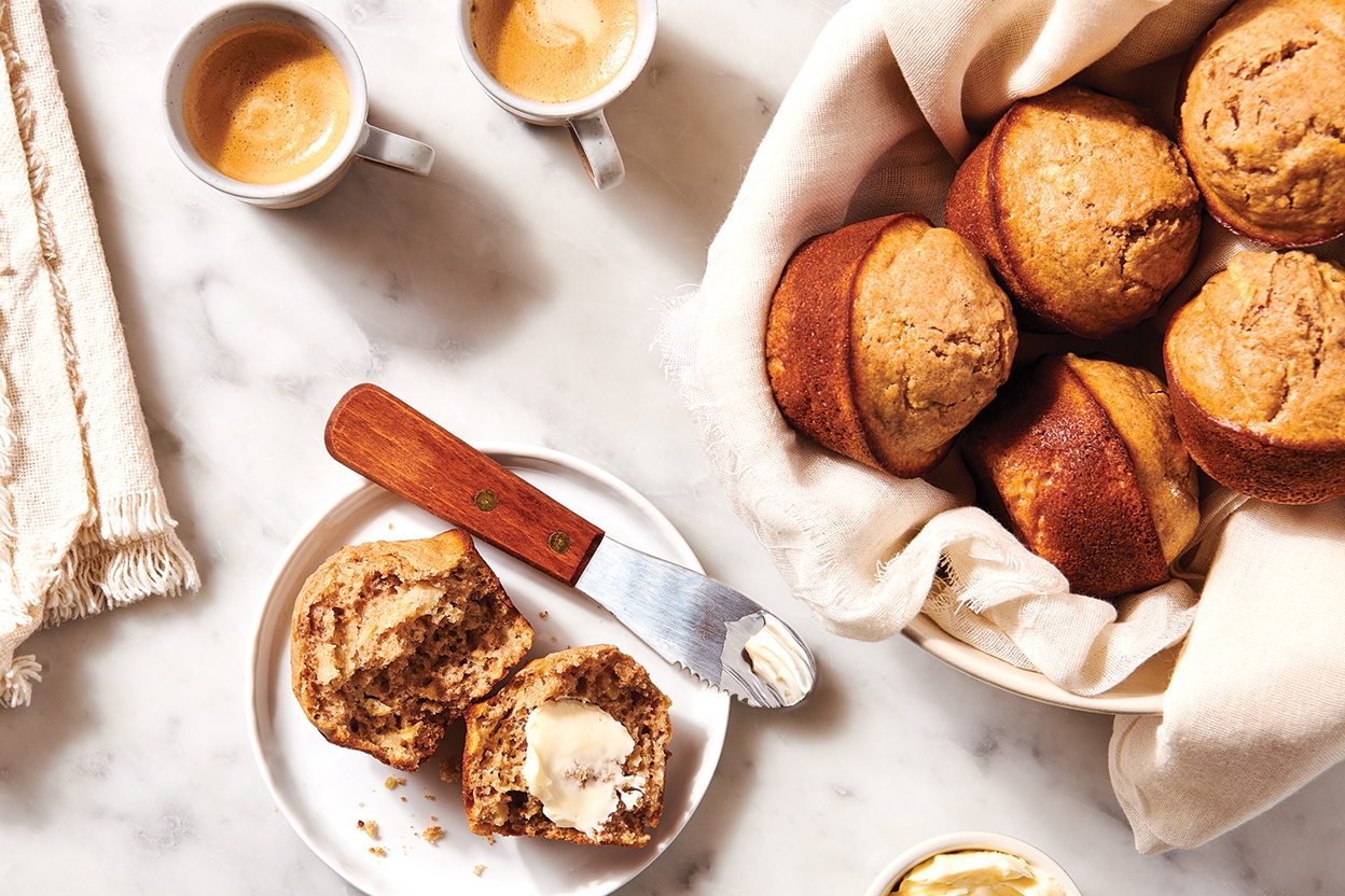 These whole grain muffins are easy to make, fast to put together, and incredibly versatile. And thanks to Climate Blend Flour, they're full-flavored and earthy while also supporting regenerative agriculture (good for you and the planet!). The slightly sweet muffins can gladly accommodate a range of mix-ins, like walnuts and raisins or chopped bacon and grated cheddar. Whether you choose to go sweet or savory, the whole grain flavor of our Climate Blend Flour will still come through.