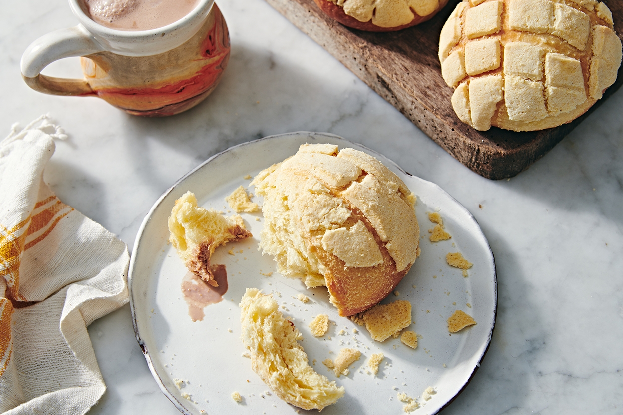 With their masa harina-sugar cookie frosting, these pan dulce from the founder and lead baker at Gusto Bread, Arturo Enciso, are a fun twist on classic Mexican conchas. The hint of maíz (corn) in the crunchy topping pairs beautifully with the soft, buttery roll below, yielding a sweet treat that’s pure comfort food. To complete the experience, Arturo recommends serving the fresh conchas with café de olla, hot chocolate, or champurrado.