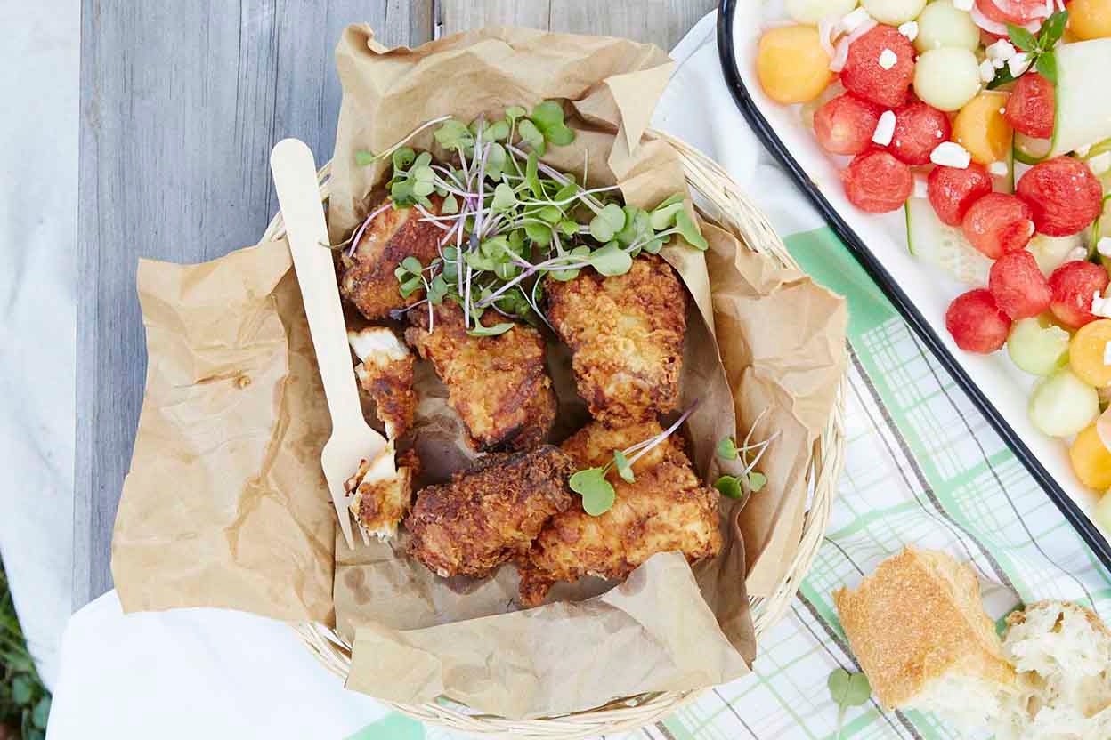 This tasty American classic is easy to make, and has far fewer calories than you might think. A seasoned buttermilk soak ensures flavorful, moist chicken pieces. Removing the skin beforehand eliminates a lot of fat and calories, and finishing the chicken in the oven on a rack allows any extra oil to drain away. Our self-rising flour and golden wheat flour make the breading tasty while boosting nutrition.
