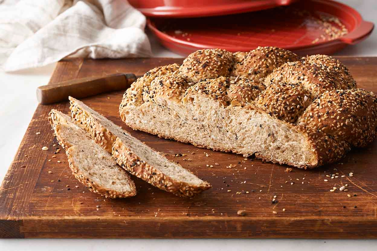Squeeze the three logs together at one end. Braid into a braid. When you get to the end, squeeze the three pieces together and tuck them underneath. Transfer the braid to a lightly greased or parchment-lined pan, brush with more egg white, and and sprinkle with any leftover seeds.