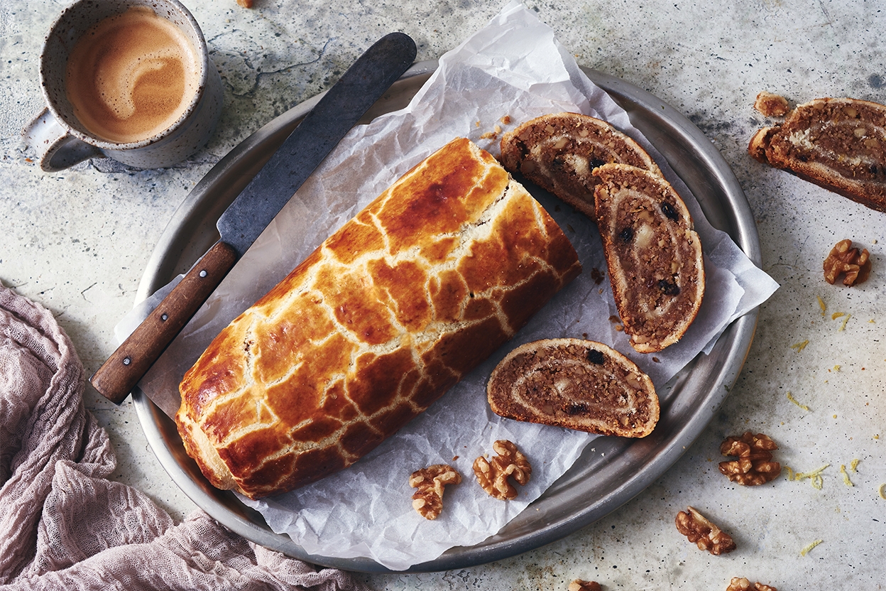 Brush the beigli with the beaten egg white then chill, uncovered, for 30 minutes. This step will help create the beigli's final crackled appearance.
