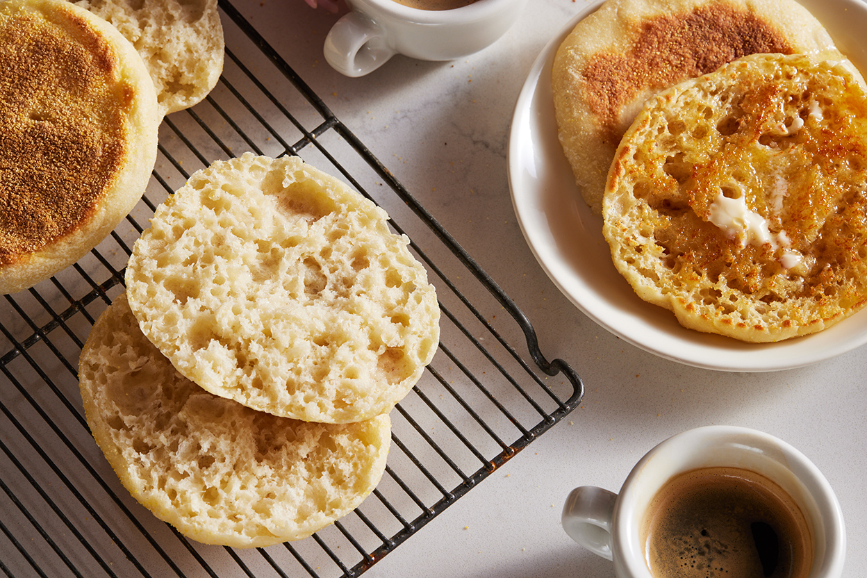 Place the muffins on a wire rack to cool slightly before serving. For the ultimate “nook and cranny” experience, fork-split the muffins before toasting and slathering with butter.