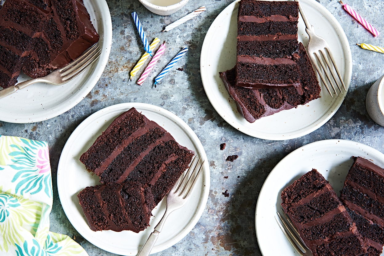 Divide the cooled layers in half horizontally, to make four layers. Place one layer on a serving plate, and spread with filling. Repeat with the next two layers. Top with the final cake layer. Note: The filling should be soft but not soupy. If it seems too runny to sit nicely atop the layers, simply let it rest at room temperature (or in the fridge, for quicker results) until it thickens up a bit.