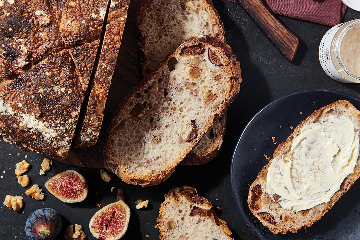 This robust, crusty sourdough is studded with rich figs and crunchy walnuts. It's a terrific partner for any artisanal cheese. If you don't have figs, dried cranberries are a tasty and colorful substitute.