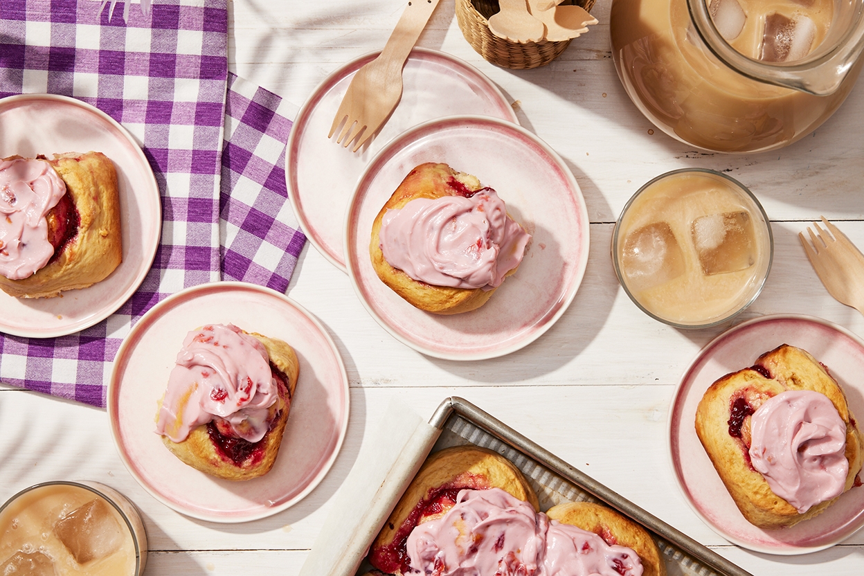 11. To make the frosting: In a large bowl, use a wooden spoon or flexible spatula to beat together the cream cheese and confectioners’ sugar until smooth. Add the reserved sour cherry jam and the pinch of salt and stir to combine. Spread frosting over the warm buns and serve immediately or let cool to room temperature.