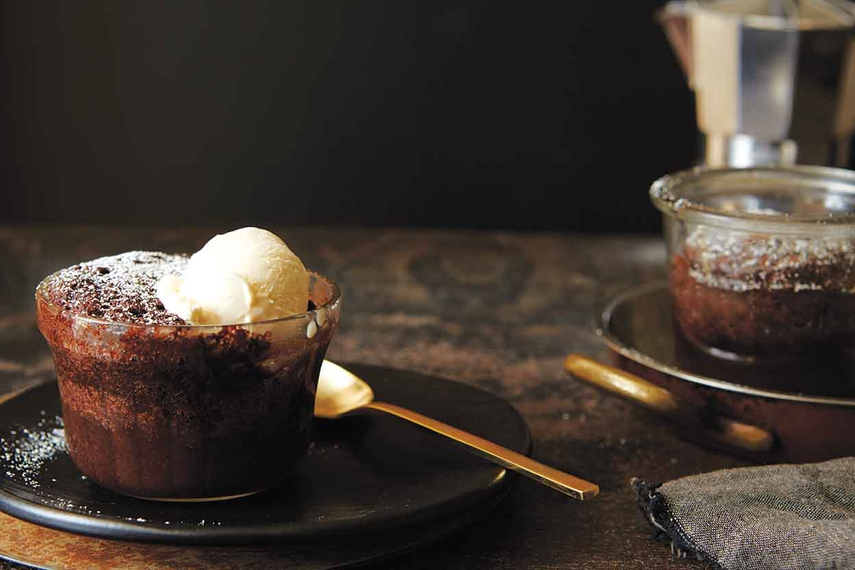 To make the pudding: Mix the brown sugar with the cocoa powder, and sprinkle this mixture over the batter in the pan or ramekins. Gently drizzle the hot coffee or water over the mixture.