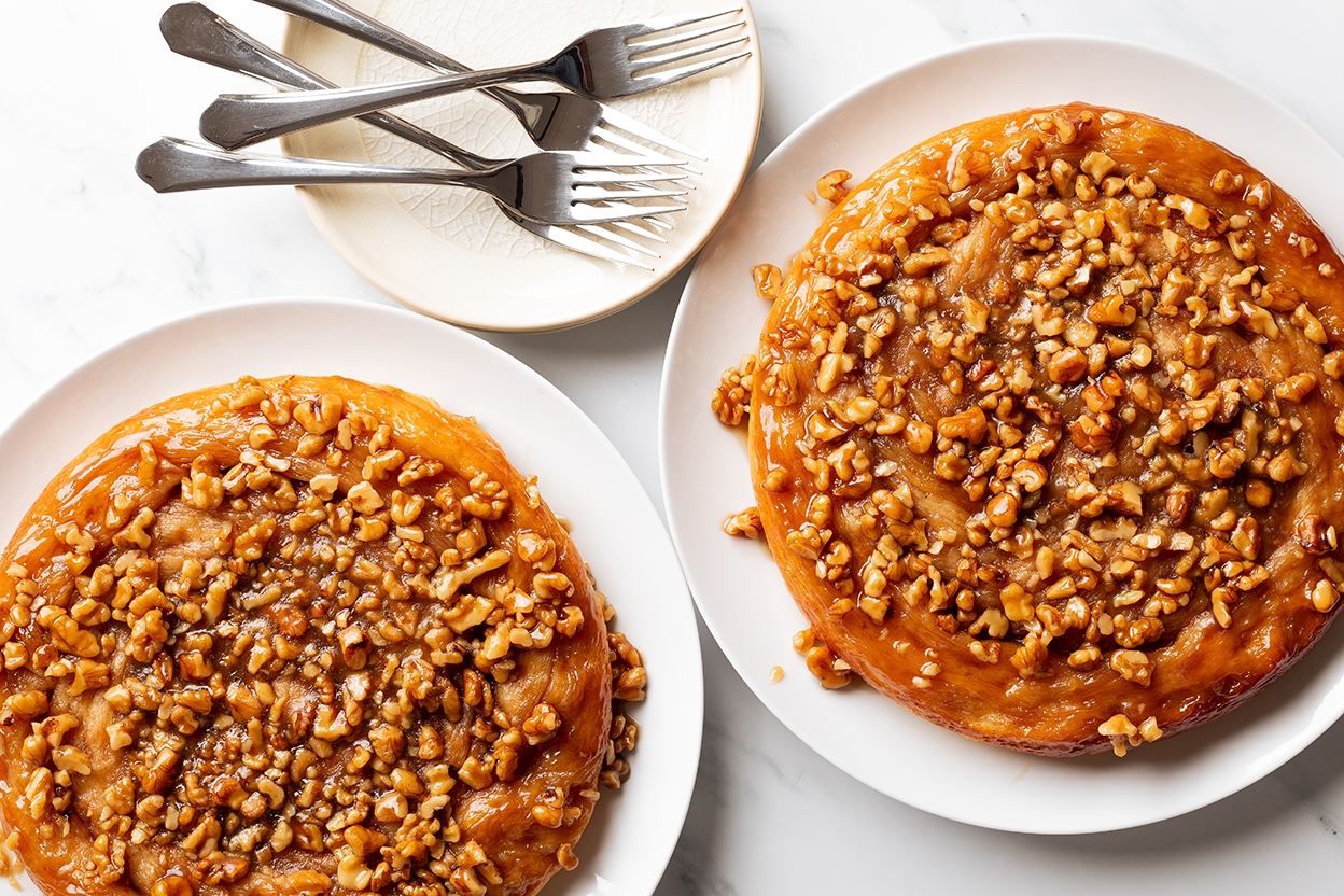 Bake the buns for 25 to 30 minutes, or until they're golden brown. Remove them from the oven, and immediately turn each pan over onto a serving plate, so the buns drop out onto the plate. Scrape any nuts or sugar left in the pan onto the bun.