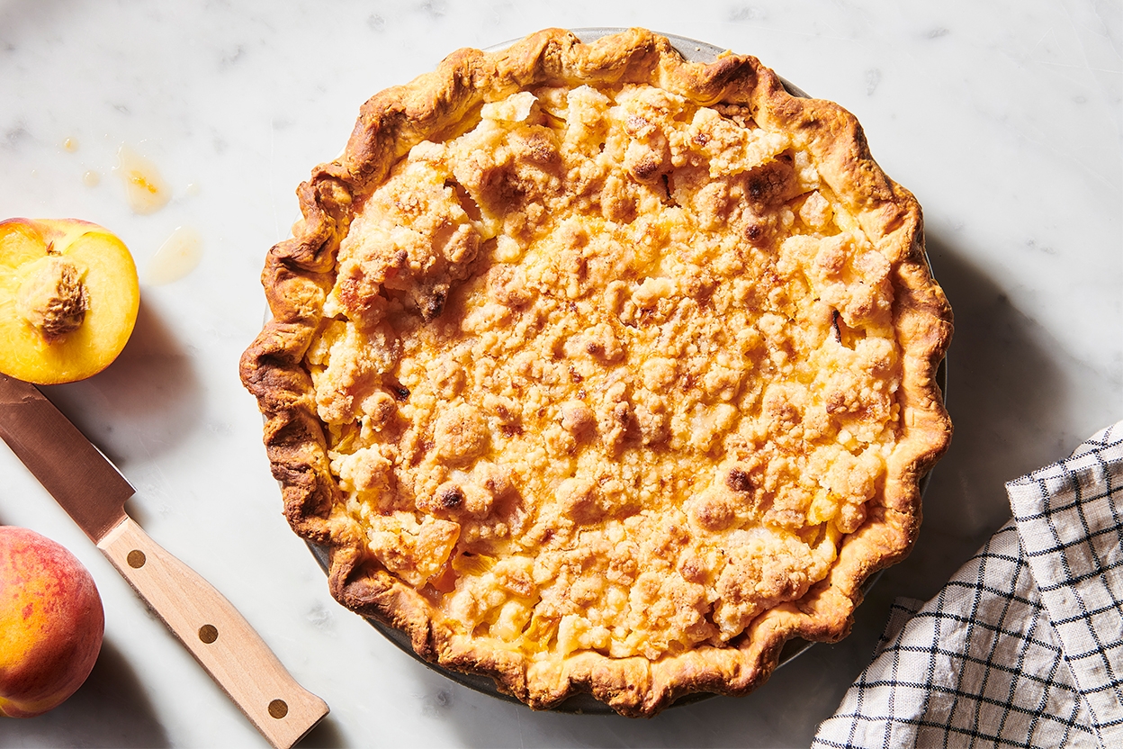 Bake for another 20 to 25 minutes, or until the pie has puffed, the streusel is very slightly browned at the edges, and/or a digital thermometer inserted into the center of the pie reads about 160°F.