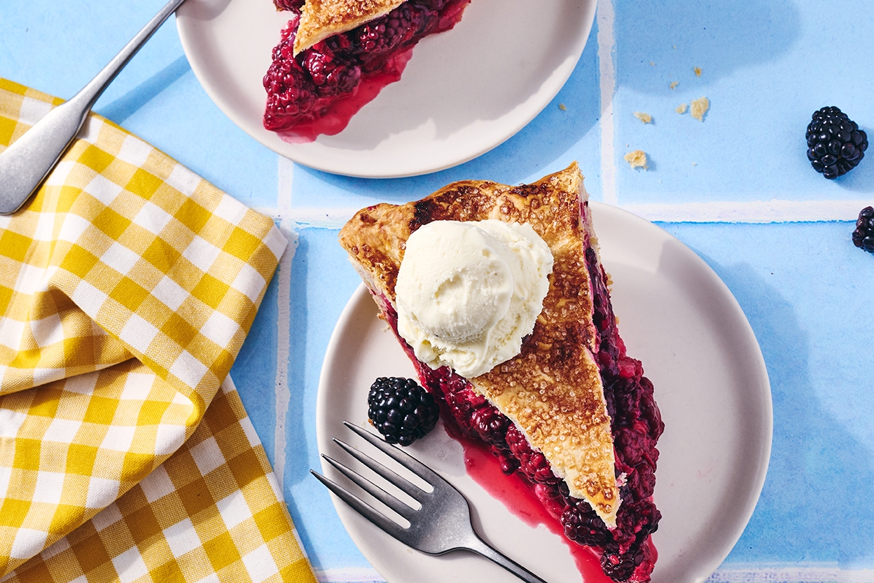 This delicious pie, courtesy of NYC-based food writer and photographer Yossy Arefi, was inspired by memories of her childhood summers in Seattle spent eating and enjoying her mom's blackberry pie. This updated version of the classic calls for generous amounts of zippy fresh ginger and sweet vanilla, which is just right with the dark berries.
