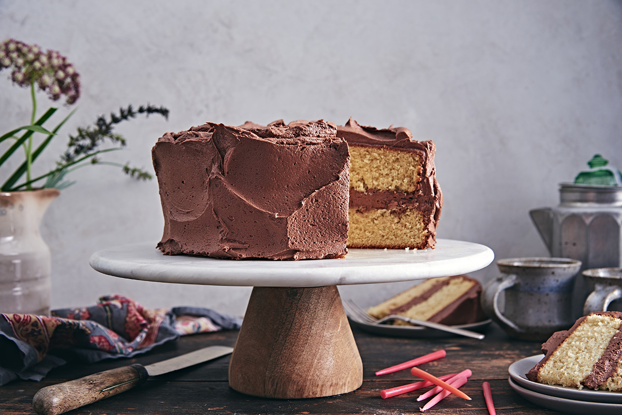 Bake the cakes until a toothpick inserted into the center comes out clean and the top feels set, 36 to 40 minutes for two 9” pans, or 43 to 48 minutes for two 8” pans; a digital thermometer inserted into the center of the cakes should read 210°F. Remove the cakes from the oven, carefully loosen the edges, and allow them to cool for 15 minutes in the pans. Then turn them out of the pans and transfer them to a rack, right-side up, to cool to room temperature.