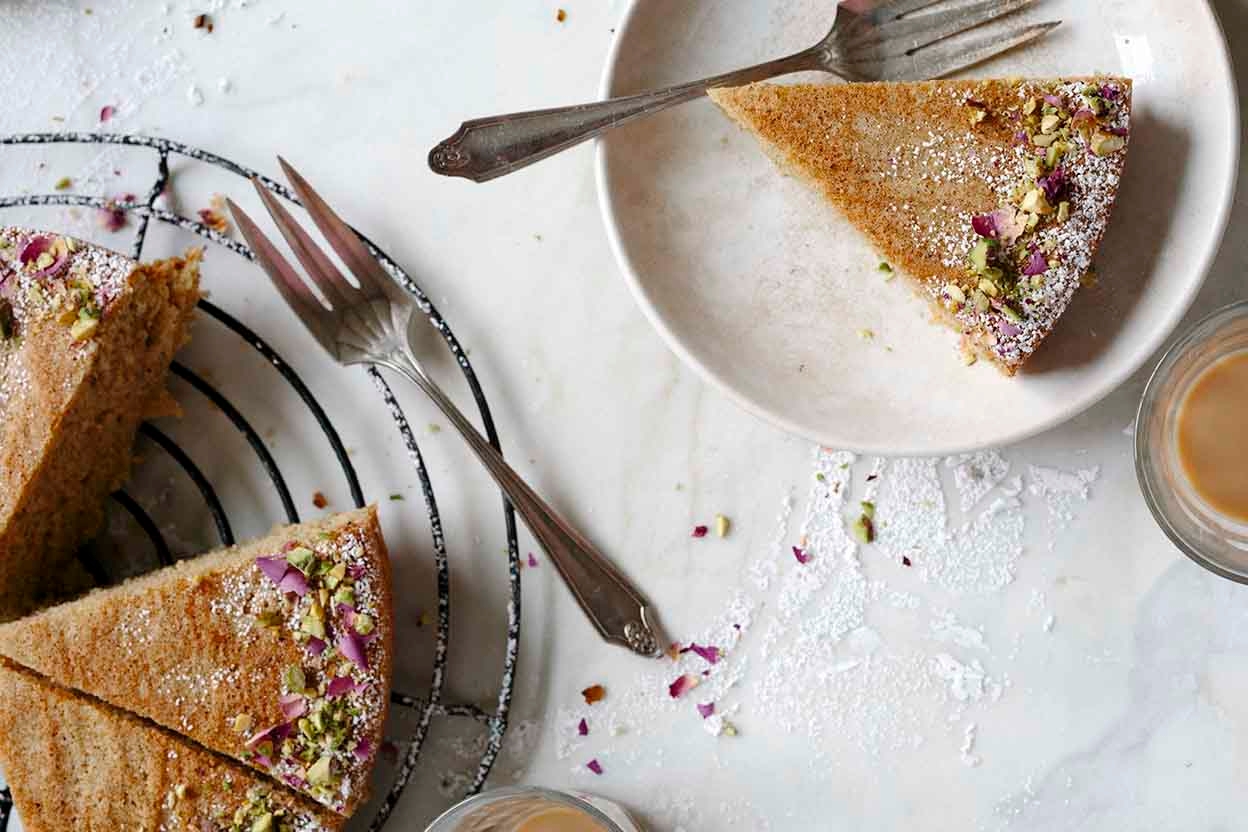 With a tender crumb, this nutty gluten-free tea cake, courtesy of Aran Goyoaga, marries the spicy flavor of cardamom with the floral fragrance of rose.