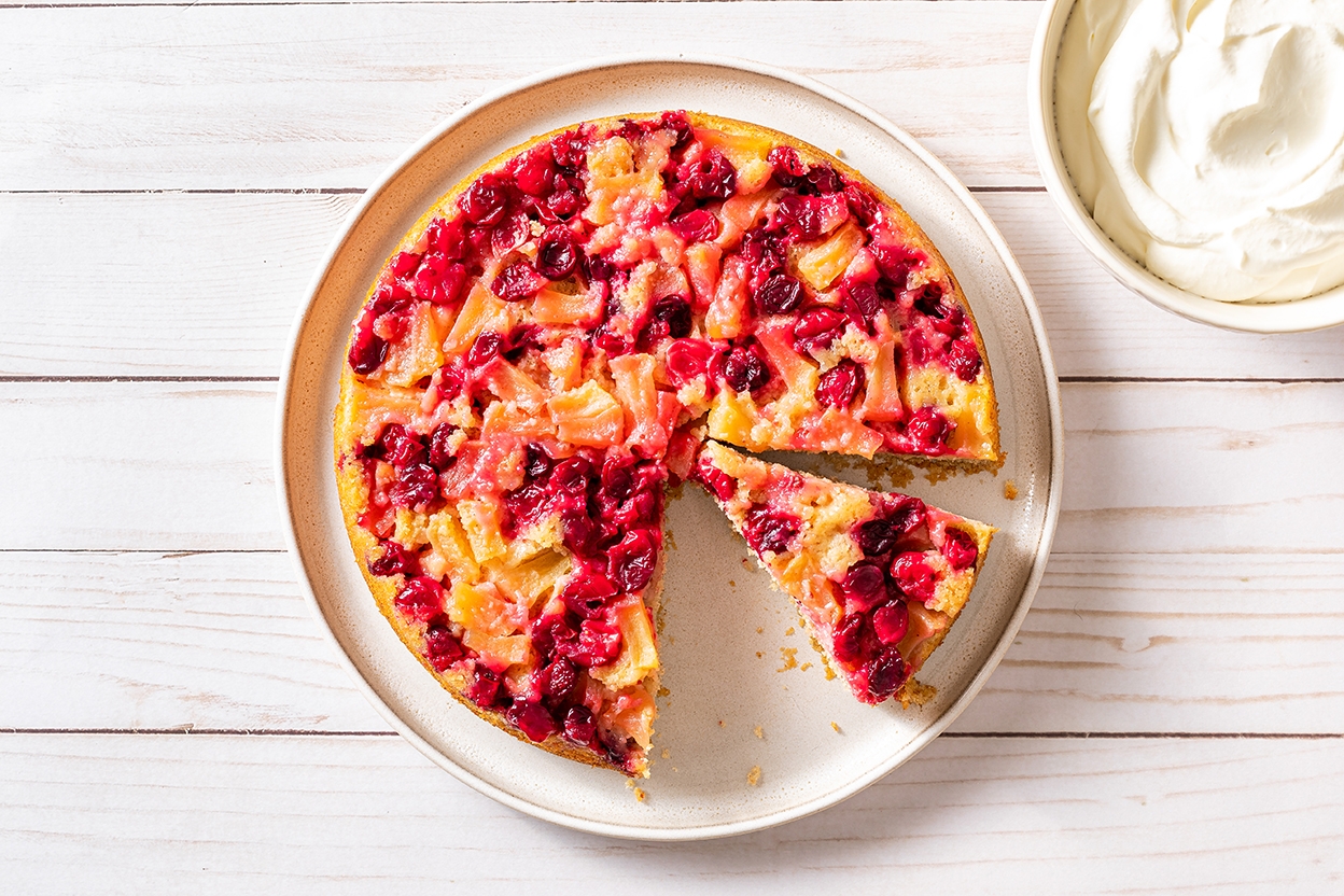Brilliant red cranberries and tender slices of apple crown this tasty autumn version of an old favorite: upside down cake.