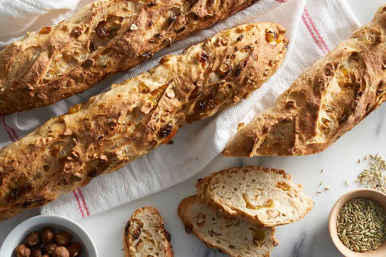 These baguettes feature a blend of fruit, nuts, and the distinctive licorice taste of fennel. Leave out the fennel if you like, but it really does lend a mild but interesting flavor to these loaves.