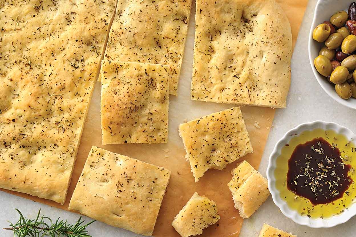 With its Mediterranean flavors and light, airy texture, this focaccia doesn't need much to accompany it. We like it shared as an appetizer just as is; or at most, perhaps alongside a creamy goat cheese.