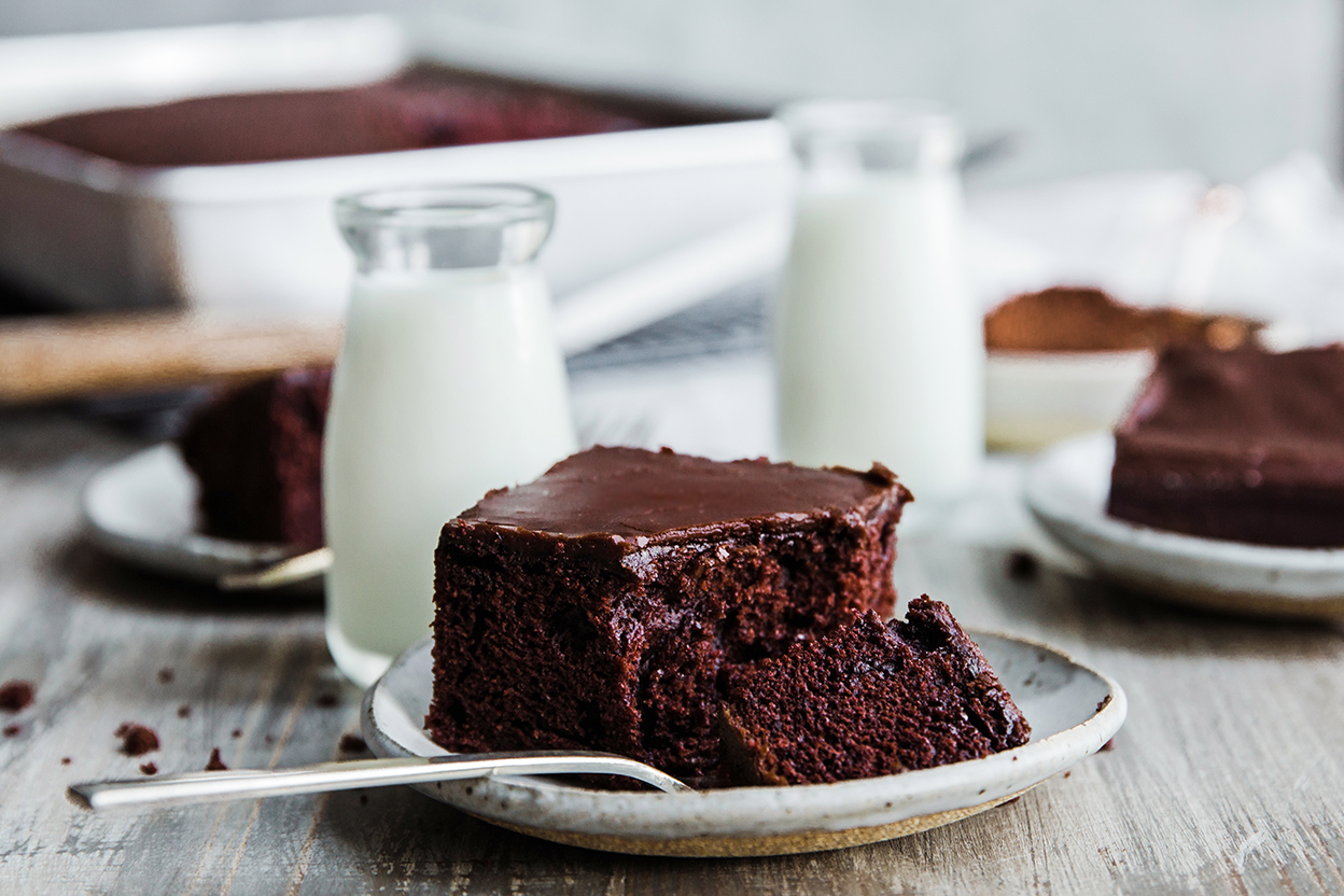 This old-fashioned chocolate sheet cake is incredibly moist, and can be stirred together by hand if need be. The fudge frosting is also stir-together simple, and creates a lovely thick layer on top. You can line the pan with parchment or foil before baking, grease it, and lift the cake out of the pan once it's cool before frosting. This makes cutting the cake easier to do, and individual portions nestle nicely into muffin papers. It's sure to be a hit at your next potluck.