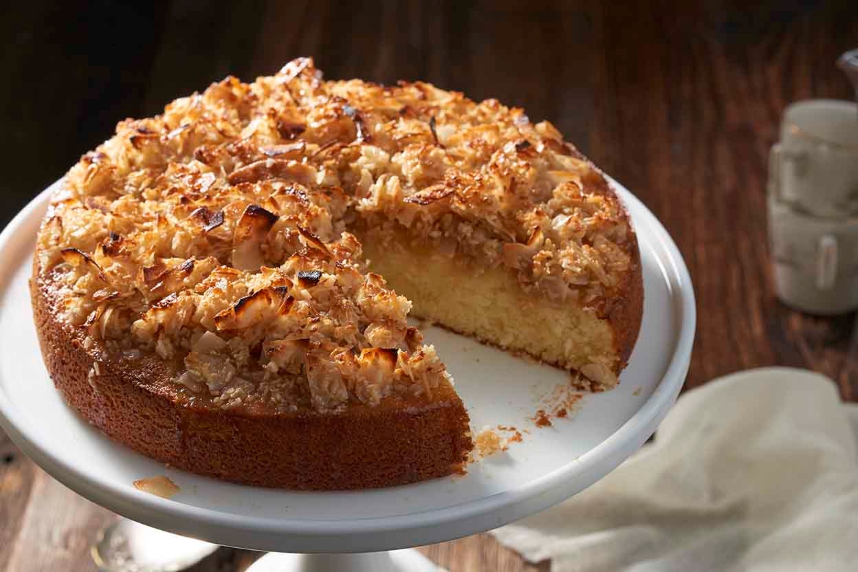 This simple yellow cake with a broiled coconut-butter-brown sugar topping is an all-time favorite. It's quick and easy, and travels very nicely right in its baking pan.