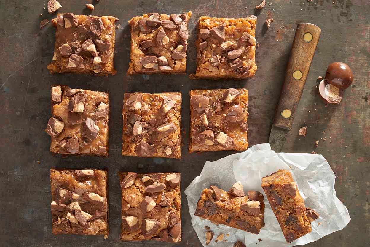 Malted milk flavors these "blonde" brownies, loaded with nuts and chips and "iced" with melted caramel.